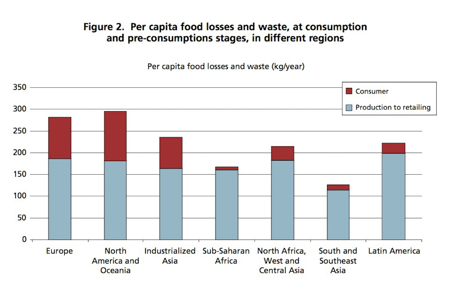 According to an FAO report, post-production loss has much to do with post-harvest crop grading of agricultural products by retailers — essentially choosing which produce will sell best based on appearance or convenience of processing.