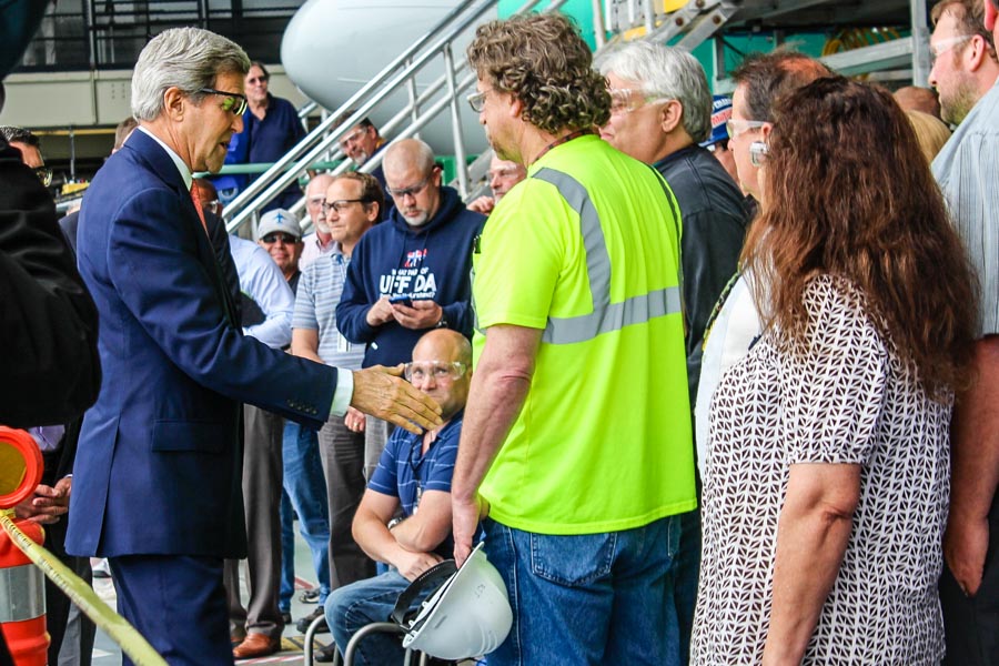 Kerry assured the crowd that while the negotiations have not been done in public, he said that labor and environmental protections will be built into the deal and that Congress will have a chance to hold hearings in public on a deal before a vote.